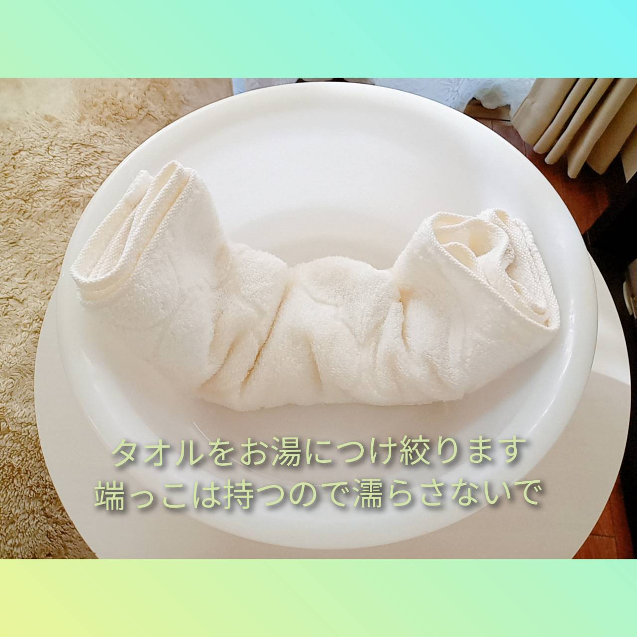 〇もう一度タオルをお湯につけて絞ります 今度は首の後ろに置いて押さえます
